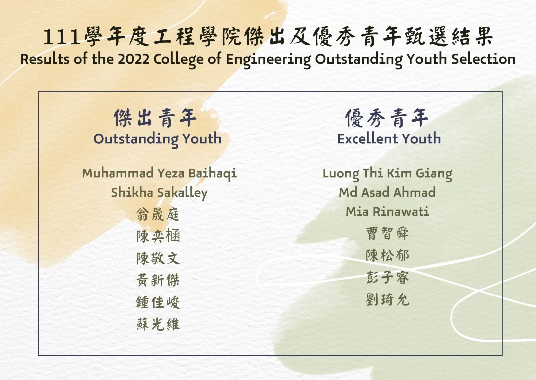院傑出青年 Outstanding Youth :Muhammad Yeza Baihaqi (自控所)、翁晟庭 (材料系)、Shikha Sakalley (機械系)、陳奕㮀 (機械系)、陳敬文 (機械系)、黃新傑 (化工系)、鍾佳峻 (機械系)、蘇光維 (IATP)。